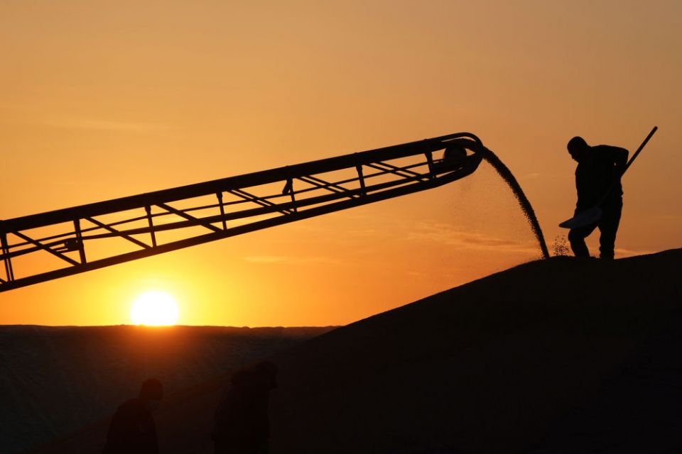 ↑2022年10月19日,在北大荒农垦集团有限公司北安分公司赵光农场有限公司,工作人员在一处晒场的玉米堆上忙碌。