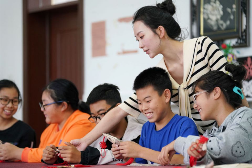 ↑2022年9月7日,尚美含指导孩子们制作赫哲族手工艺品。