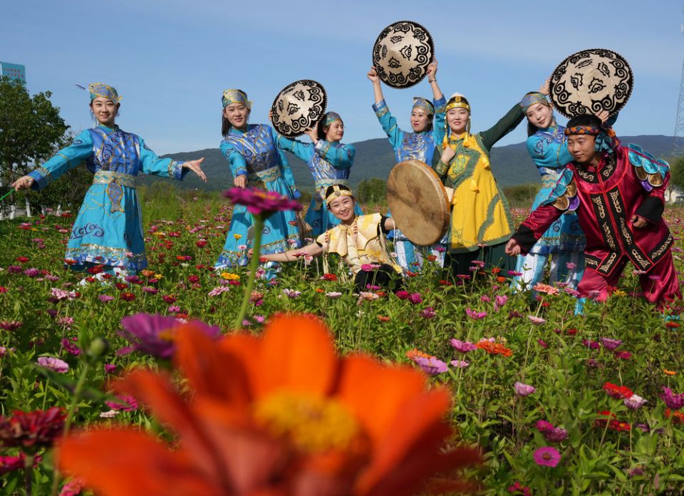 ↑2022年9月4日,尚美含(右二)和赫哲族青年排练民族舞蹈。