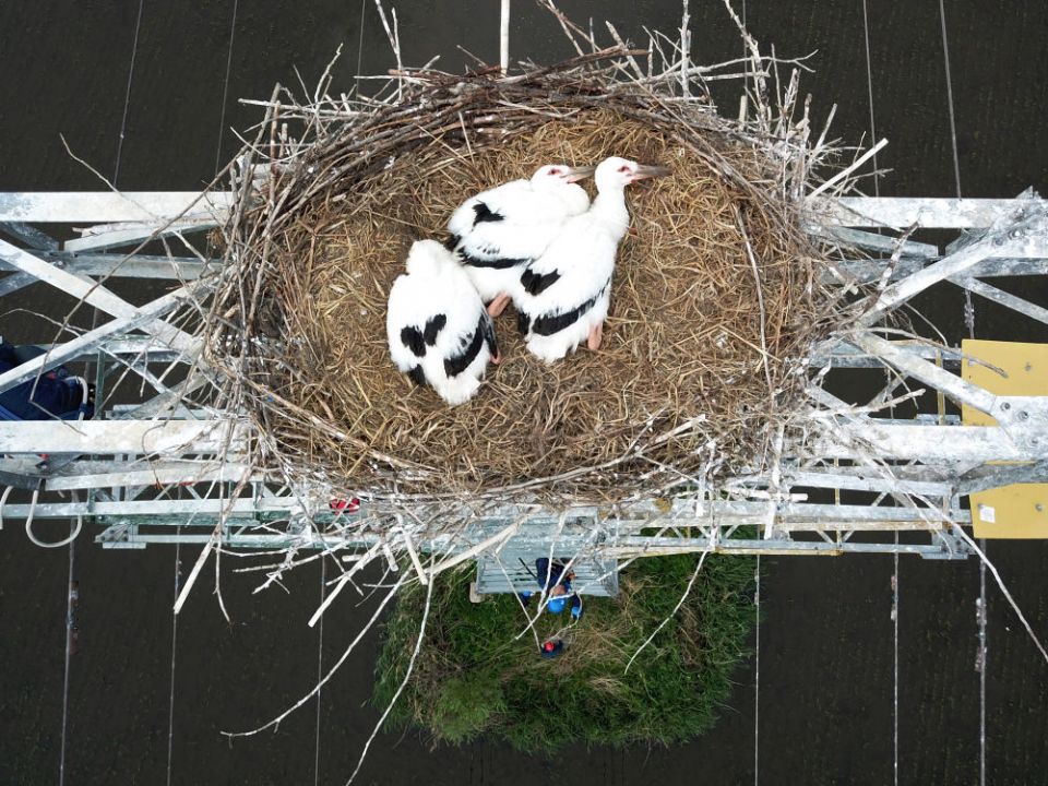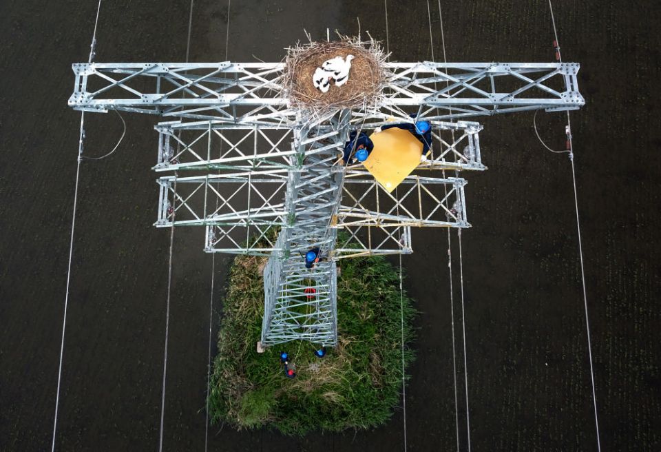 ↑2022年6月15日,电力工人在输电铁塔上的鸟巢下安装护鸟板,鸟巢里,东方白鹳的幼鸟在等待着成鸟归来。