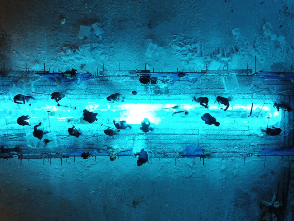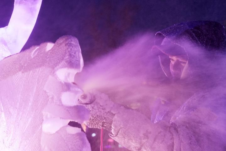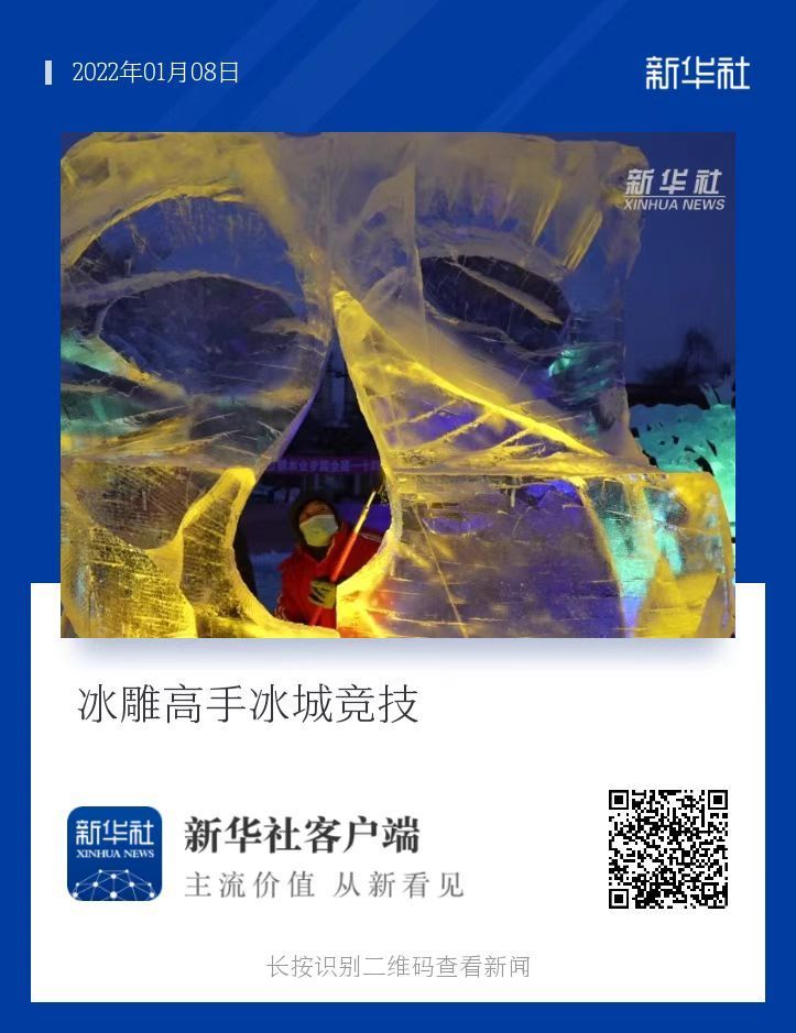 ↑2022年1月7日,冰雕师在哈尔滨冰灯艺术游园会园区参与全国专业冰雕比赛。