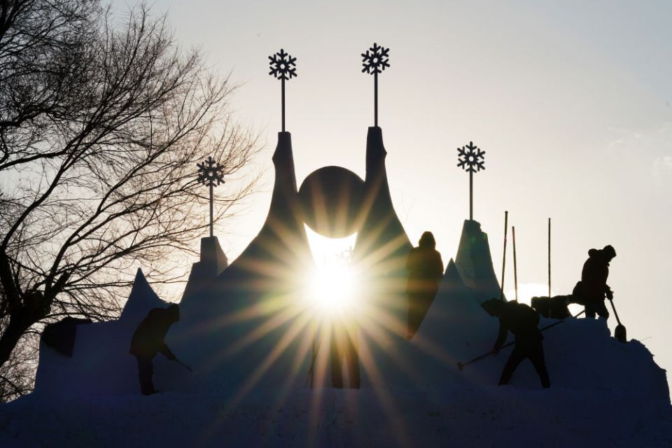 ↑2022年1月12日,在哈尔滨太阳岛雪博会园区的雪雕比赛现场,雪雕师在创作中。
