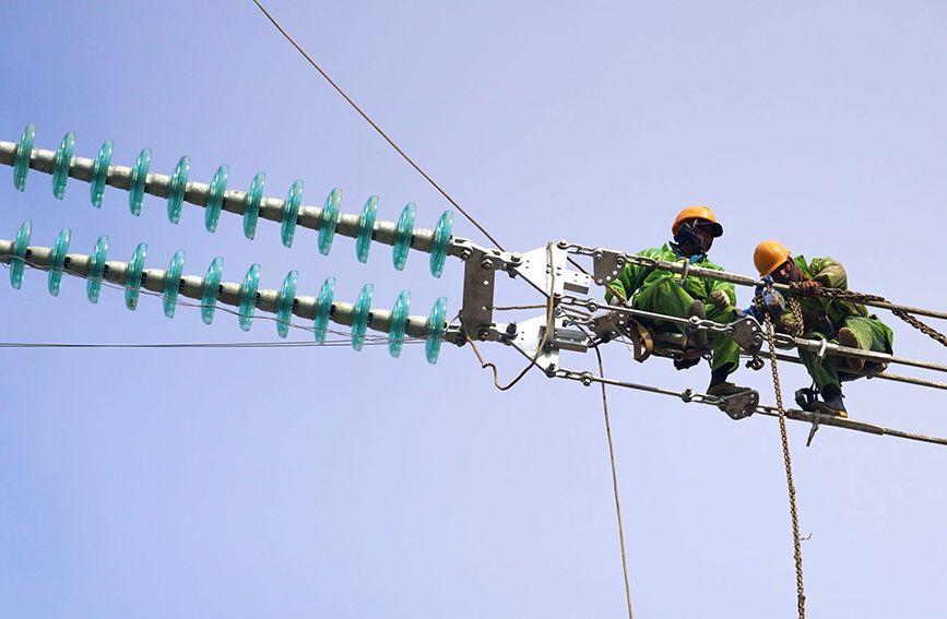 输电塔上的“蜘蛛人”。人民网 记者郭扬摄