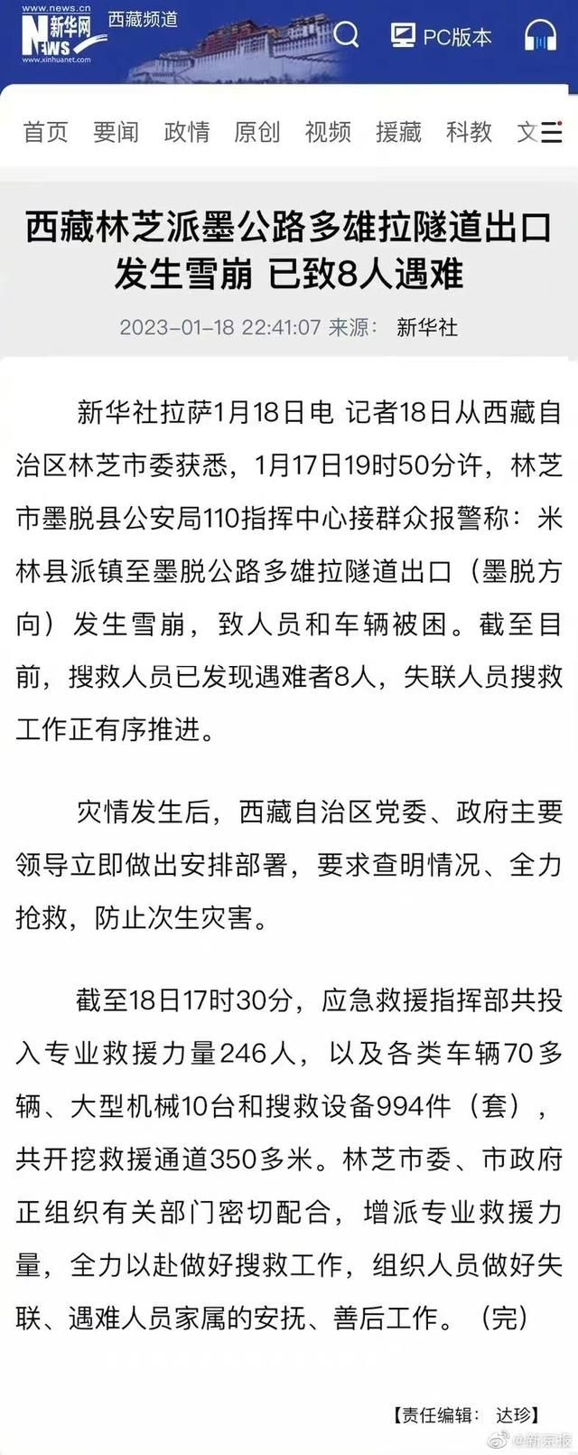 据新华社报道,1月17日19时50分许,西藏自治区林芝市墨脱县公安局110指挥中心接群众报警称:米林县派镇至墨脱公路多雄拉隧道出口(墨脱方向)发生雪崩,致人员和车辆被困。截至18日22时,搜救人员已发现遇难者8人,失联人员搜救工作正有序推进。