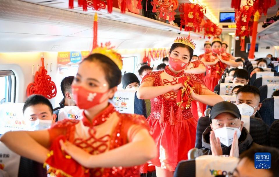 首页 列车上的“春晚” 将欢乐带回家 2023-01-20 09:37:24 分享 1月19日,银川客运段工作人员在由银川开往兰州的D8933次列车上为旅客表演舞蹈。临近春节,中国铁路兰州局集团有限公司银川客运段将部分列车车厢装扮一新,组织青年职工在列车上表演自编的节目,为旅客送上小礼物,让人们将旅途中的欢乐带回家。新华社记者 冯开华 摄
