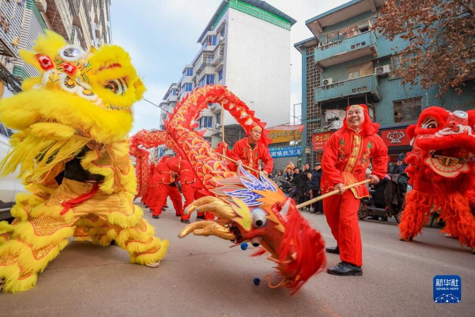 首页 品民俗 寻年味 2023-01-20 09:50:19 分享 1月19日,民间艺人在四川省遂宁市蓬溪县蓬南镇街头表演舞龙、舞狮。当日,四川省遂宁市蓬溪县蓬南镇举行新春民俗巡游活动。活动现场,民间艺人表演了舞龙、舞狮、腰鼓、秧歌、扇子舞等民俗节目。新华社发(刘昌松 摄)
