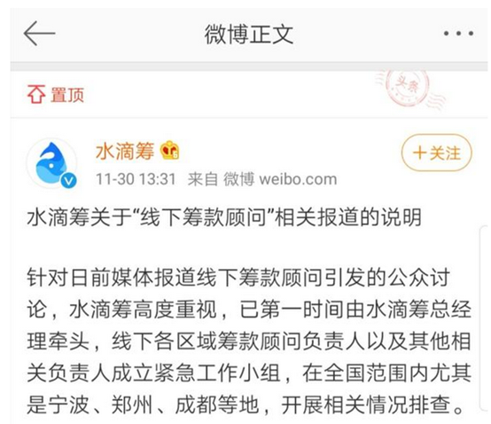 针对此事,水滴筹于11月30日在其官微上发文回应称,报道中内容属于部分地区个别线下人员的违规现象,调查清楚后,公司将给以严惩。即日起,线下服务团队全面暂停服务,整顿彻查类似违规行为。