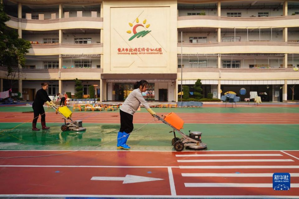 首页 精心准备迎开学 2023-02-01 09:42:50 分享 1月31日,在重庆市北碚区一家幼儿园,两名工人在清洗校园地面。新学期临近,重庆市北碚区各中小学、幼儿园的教职员工纷纷回到校园,做好开学前的各种准备,迎接新学期的到来。新华社发(秦廷富 摄)
