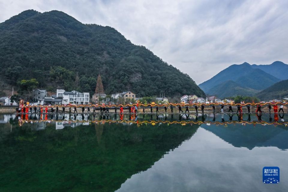首页 山乡女子板龙队迎元宵 2023-02-02 09:16:23 分享 2月1日,窈口村女子板龙队在湖源乡的龙鳞坝碇步桥上进行舞龙表演。当日是农历正月十一,在梅花锣鼓的伴奏下,浙江省杭州市富阳区湖源乡窈口村女子板龙队举起由50余张板凳连起来的百米板龙舞动起来,拉开了湖源乡新春系列迎元宵活动的序幕。作为杭州市富阳区非物质文化遗产,湖源乡窈口村女子板龙有200多年的历史,寄托百姓对风调雨顺、五谷丰登的美好愿望。新华社记者 徐昱 摄