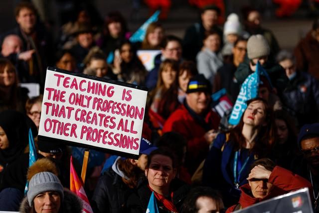 路 透社1日引述英国国家教育工会负责人的话称,教师们感到自己别无选择,“在过去12年时间里,他们的工资出现了灾难性的长期下降”,“在我身后的这些人今 天并不想罢工,但他们无奈地表示自己受够了,事情必须有所改变”。但英国教育大臣基根1日依旧坚持政府立场,“我们不能为一部分劳工提供跟得上通胀率的加 薪,这样每个人面临的通胀情况都将更糟糕”。