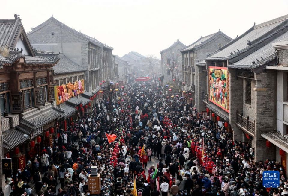 首页 千年庙会 社火闹春 2023-02-07 08:56:55 分享 2月6日,社火团队在庙会上行进。当日是农历正月十六,在河南省浚县举行的正月古庙会上,几十支社火团队轮番表演,踩高跷、扭秧歌、耍狮子,锣鼓喧天,热闹非凡,形成一道富有特 色的中原文化景观。河南省浚县的正月古庙会已有1600多年历史,有“华北第一庙会”之称,被誉为民俗文化的“活化石”,是中国民间文化保护工程项目、国 家级非物质文化遗产。新华社记者 兰红光 摄
