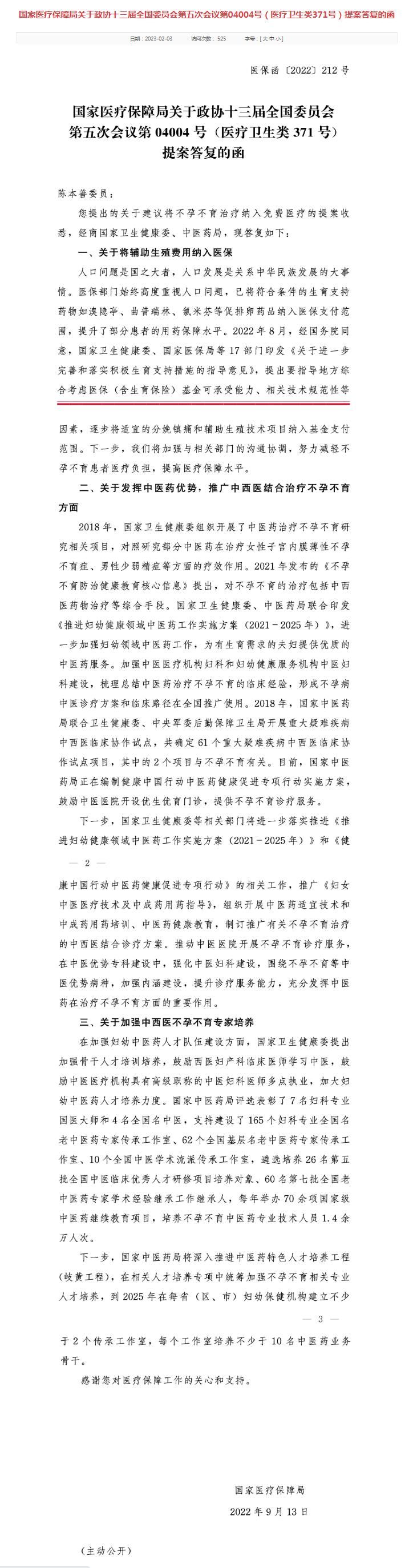 针 对关于建议将不孕不育治疗纳入免费医疗的提案,国家医保局近日答复,医保部门始终高度重视人口问题,已将符合条件的生育支持药物,如溴隐亭、曲普瑞林、氯 米芬等促排卵药品纳入医保支付范围,提升了部分患者的用药保障水平。2022年8月,经国务院同意,国家卫生健康委、国家医保局等17部门印发《关于进一 步完善和落实积极生育支持措施的指导意见》,提出要指导地方综合考虑医保(含生育保险)基金可承受能力、相关技术规范性等因素,逐步将适宜的分娩镇痛和辅助生殖技术项目纳入基金支付范围。