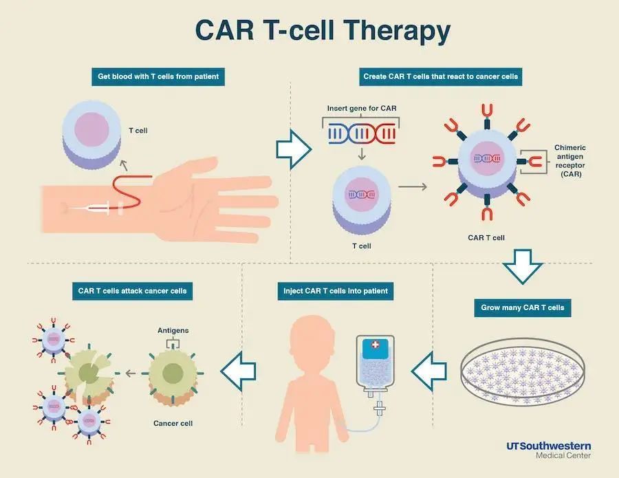 CAR-T疗法指嵌合抗原受体(CAR)T细胞免疫疗法,涉及从患者血液中提取出T细胞,然后在实验室对它们进行改造,使其能识别癌细胞,经过改造的T细胞随后被重新注入患者体内,以攻击癌细胞。
