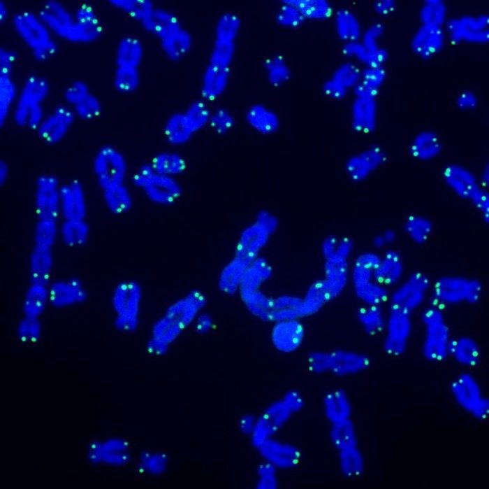 端粒保护染色体末端免受损伤。此图像显示DNA修复活动期间的端粒(绿色)和 DNA(蓝色)。