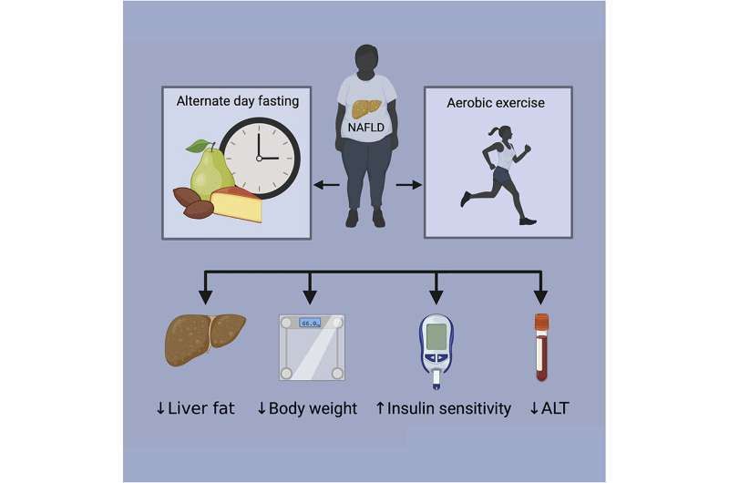 研究人员报告说,在3个月的时间里,锻炼并隔日禁食(一天饮食不受限制,第二天摄入500卡路里或更少)的人胰岛素敏感性增加、肝脏脂肪减少、体重和ALT(丙氨酸转氨酶)下降。