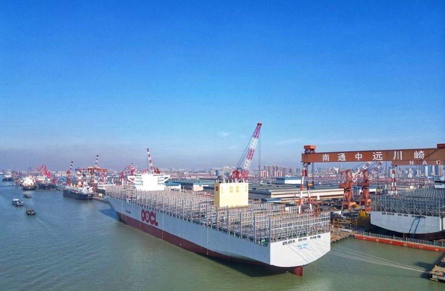 人民网南通2月16日 (记者王继亮)16日上午,全球顶级装载量集装箱船“东方西班牙”号(“OOCL SPAIN”)在江苏南通完工,该船是目前世界上尺度最大的船舶之一,能装24188标箱。