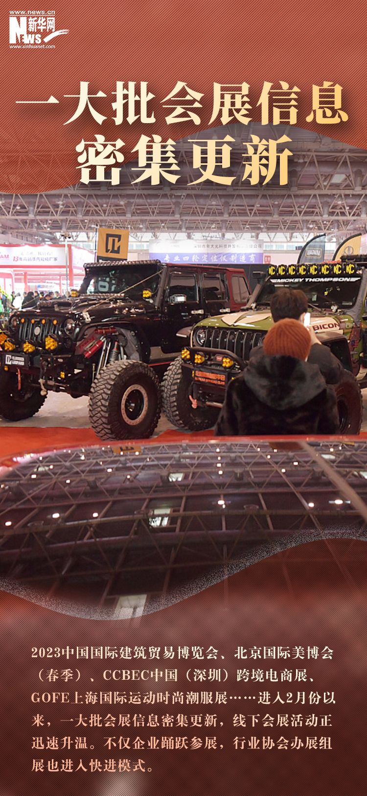 2023中国国际建筑贸易博览会、北京国际美博会(春季)、CCBEC中国(深圳)跨境电商展、GOFE上海国际运动时尚潮服展……进入2月份以来,一大批会展信息密集更新。展示产品、结识客户、交流信息、共寻商机,线下会展活动正迅速升温。