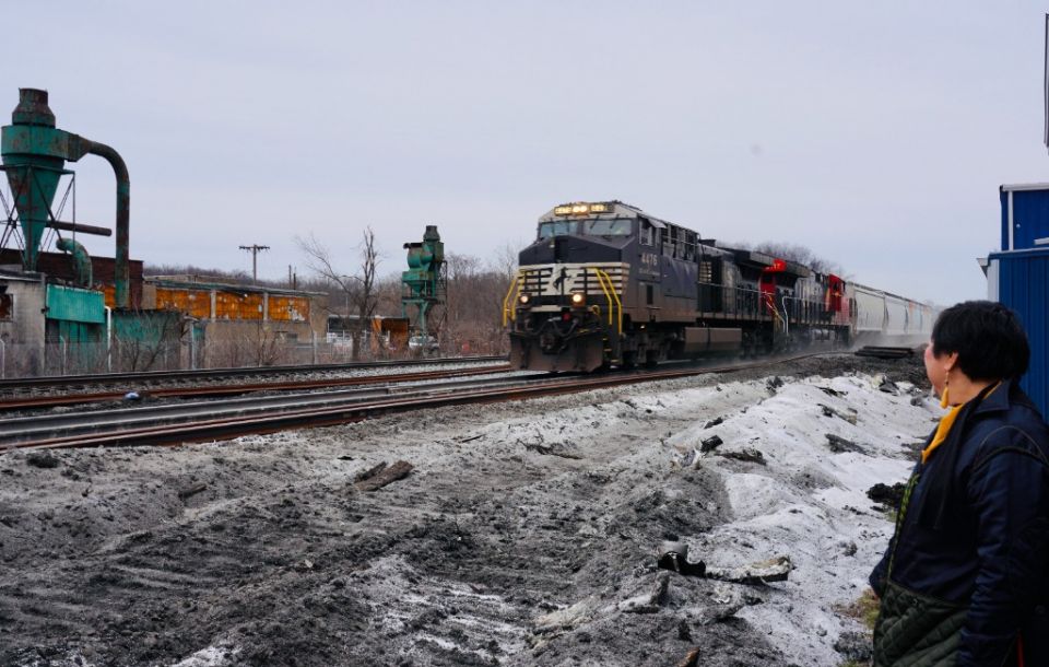 2月14日,诺福克南方铁路公司货运列车驶过美国俄亥俄州东巴勒斯坦镇。新华社发(章焱飞摄)