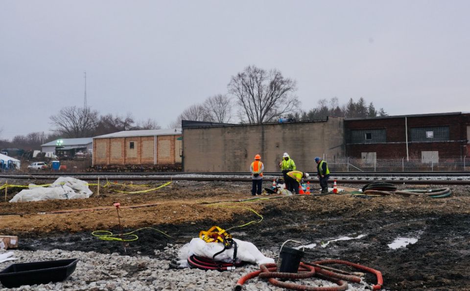 2月14日,在美国俄亥俄州东巴勒斯坦镇,工作人员在事故现场附近处理污水。新华社发(章焱飞摄)