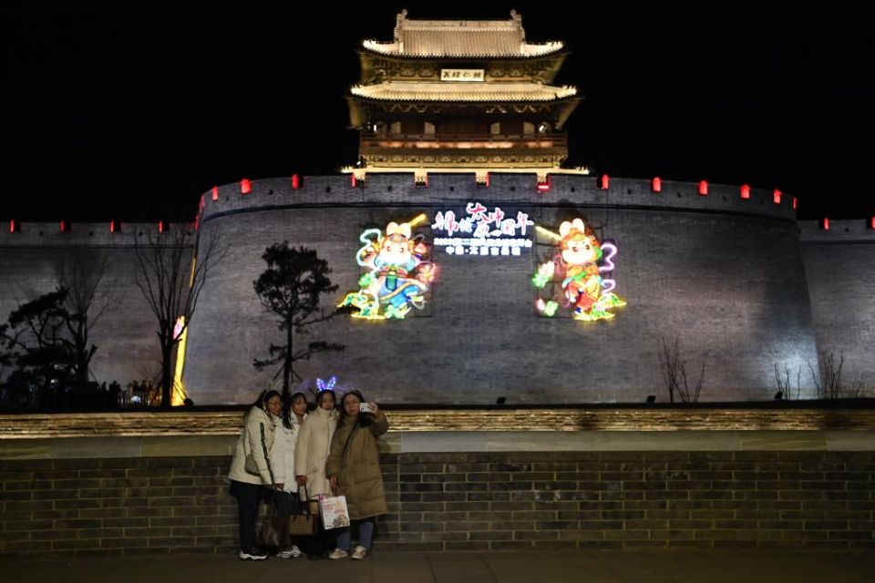 1月28日,游客在山西太原古县城前合影。 新华社记者 杨晨光 摄