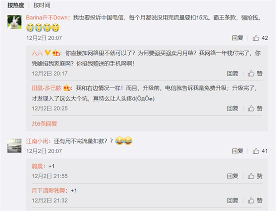 有网友在评论中表示也有类似遭遇,称:“每个月都说没用完流量要扣15元。霸王条款,强抢钱。”六六认为,“你直接加网络里不就可以了?为何要强买强卖月月结?我网络一年钱付完了,你凭啥掐我家庭网?你掐我赠送的手机网啊!”