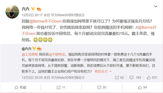 @六六 在微博称:“@工信微报我投诉@中国电信,强迫我购买家庭网络的时候拿一部免费送十几个G流量的手机。每个月不用完流量就扣款,我在年费一次缴纳完的情况下,隔三差五因赠送手机流量没用完被停家庭网络,从不提前预警,说断就断。我在续费后从不即时开通,要不断联系他们,且联系不上。这样的霸王企业我们用户有没有权力?”