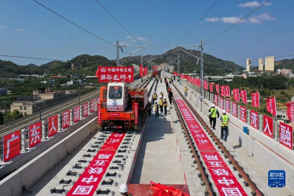 首页 广汕铁路正线铺轨贯通 2023-02-24 08:46:26 分享 2月23日,中铁五局轨道铺架车在汕尾东冲特大桥铺设广汕铁路正线最后一组500米长轨(无人机照片)。当日,中铁五局承建的广汕铁路正线最后一组500米长轨在汕尾东冲特大桥铺设完成,该线正线铺轨实现贯通。广汕铁路是“轨道上的大湾区”高铁骨 干网重要组成部分,该线全长202公里,时速350公里,途经广州、惠州、深汕特别合作区、汕尾。全线通车后,广州到汕尾运行时间将缩短至1小时以内。新华社记者 刘大伟 摄