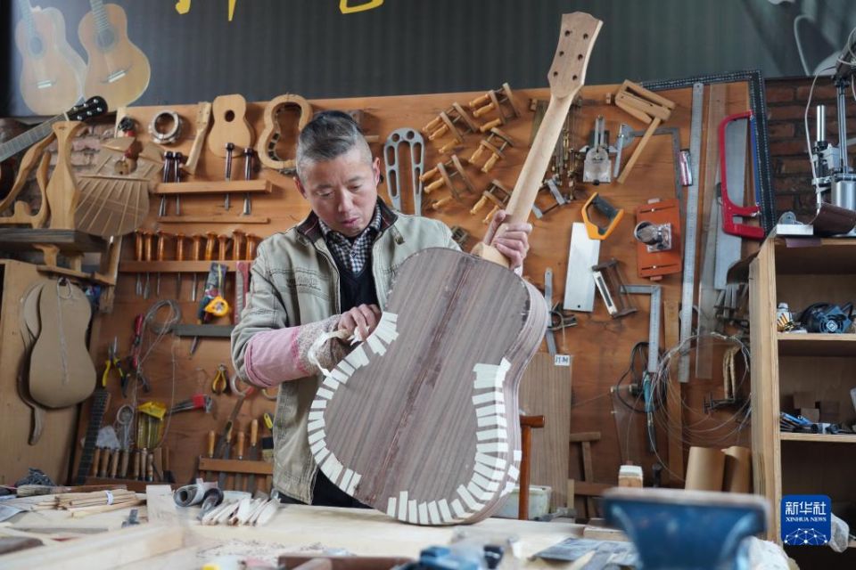 科创 乐器产业奏响乡村振兴“幸福曲” 2023-02-27 10:56:58 分享 2月26日,吉他艺人在河北省武强县周窝音乐小镇一家吉他工坊内制作吉他。河北省武强县乐器产业至今已有30多年的发展历史。在当地政府的政策扶持与龙头企业的辐射带动下,武强县乐器产业实现了集群化、规模化发展。截至目前,该县乐器生产企业达63家,从业人员1万余人,产品涵盖400余种,畅销80多个国家和地区。近年来,武强县依托乐器文化产业资源,打造集乐器加工、乐器体验、音乐展演和休闲度假等业态为一体的周窝音乐小镇,并创新“乐器+”乡村振兴模式,持续增强乐器产业的富民强县作用。新华社记者 牟宇 摄