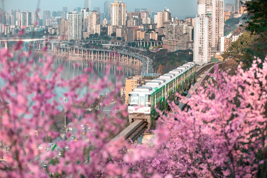 穿越花海的重庆轨道交通2号线。龚梦源摄