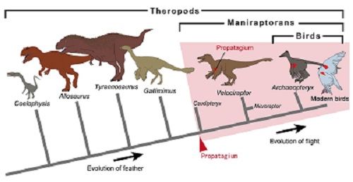根据这一线索,研究小组发现,前膜很可能是从一群被称为手盗龙类的兽脚类恐龙身上进化出来的。在保存下来的软组织化石中识别出的前膜证实了这一点,这些软 组织化石包括有羽毛的窃蛋龙类尾羽龙和有翅膀的驰龙类小盗龙。他们发现的所有标本在该谱系的飞行进化之前就已存在。