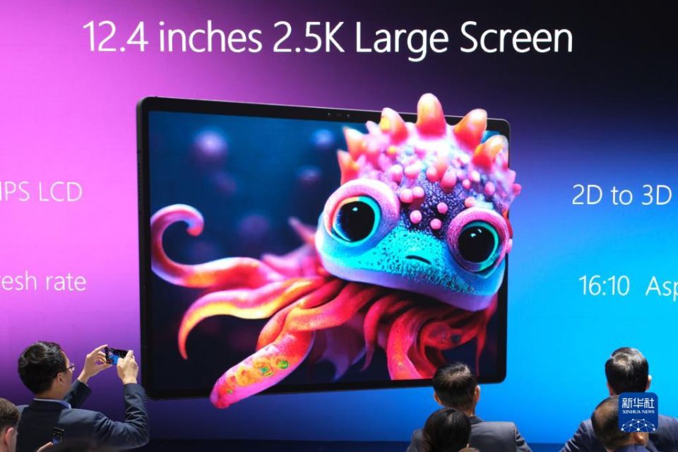 2月28日,在西班牙巴塞罗那,人们在世界移动通信大会上观看中兴裸眼3D平板电脑发布会。新华社记者 孟鼎博 摄