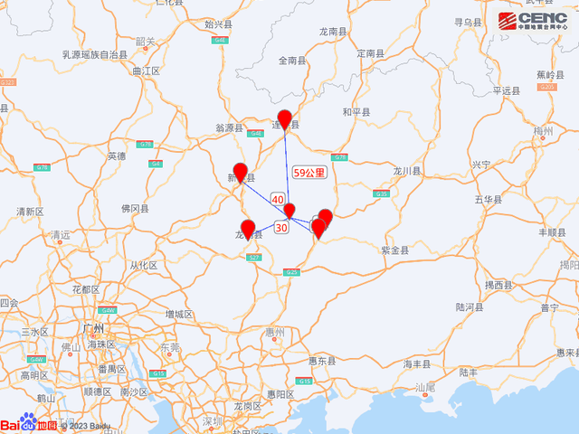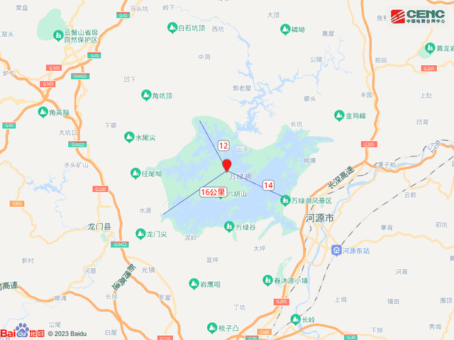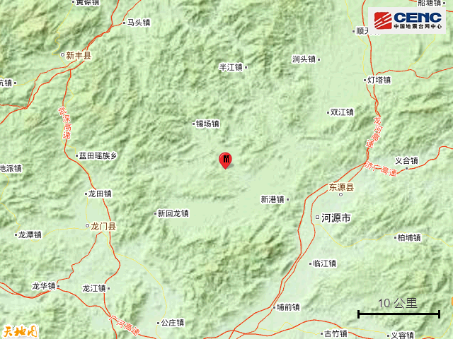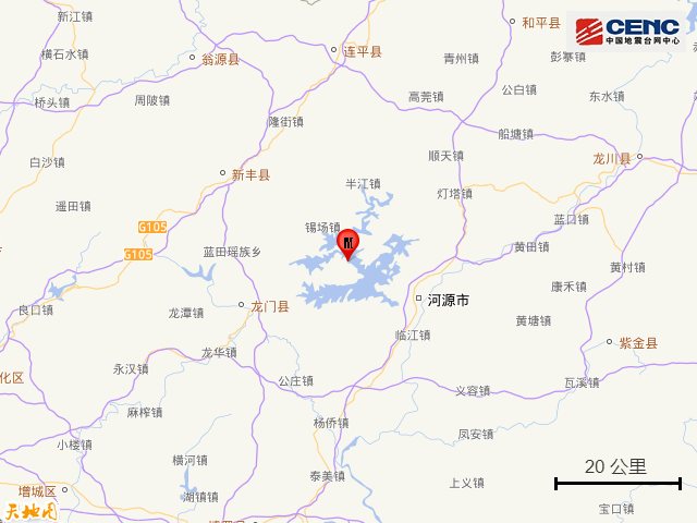 震中距源城区22公里、距东源县24公里、距龙门县30公里、距新丰县40公里、距连平县59公里,距河源市21公里,距广州市150公里。