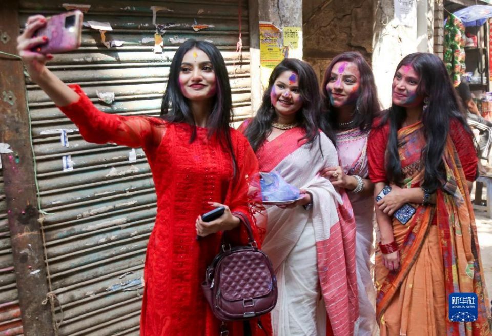 3月7日,人们在孟加拉国达卡参加洒红节庆祝活动。