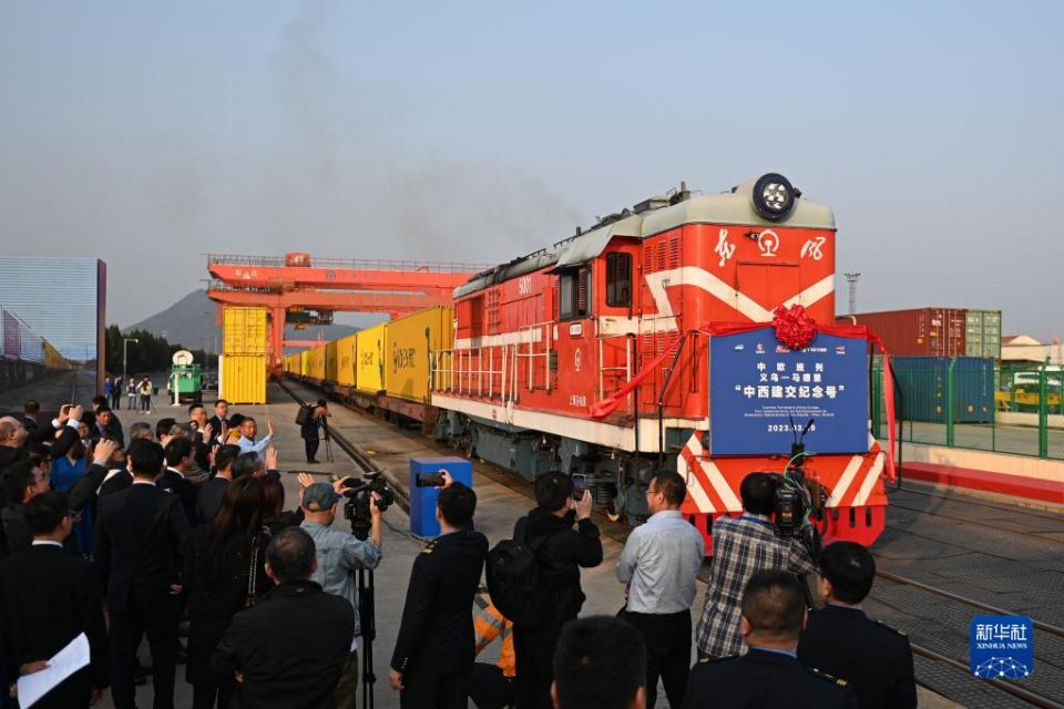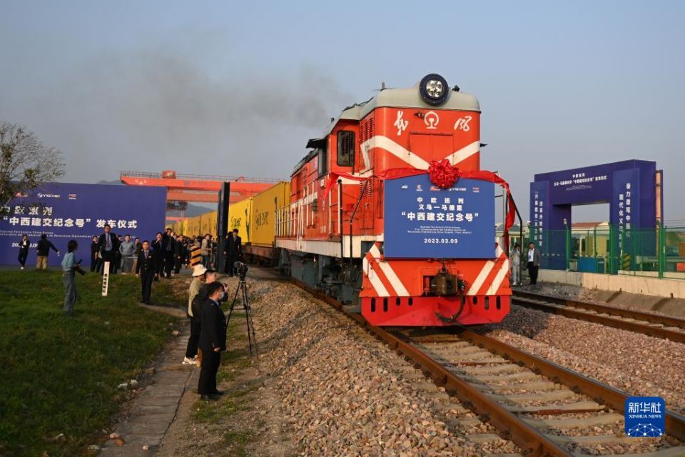 新华社杭州3月9日电(记者屈凌燕、魏董华)3月9日下午,一列满载着100个标箱小商品、电子产品、日用百货等货物的“中西建交纪念号”中欧班列从浙江义乌铁路西站鸣笛启程,奔赴西班牙首都马德里。