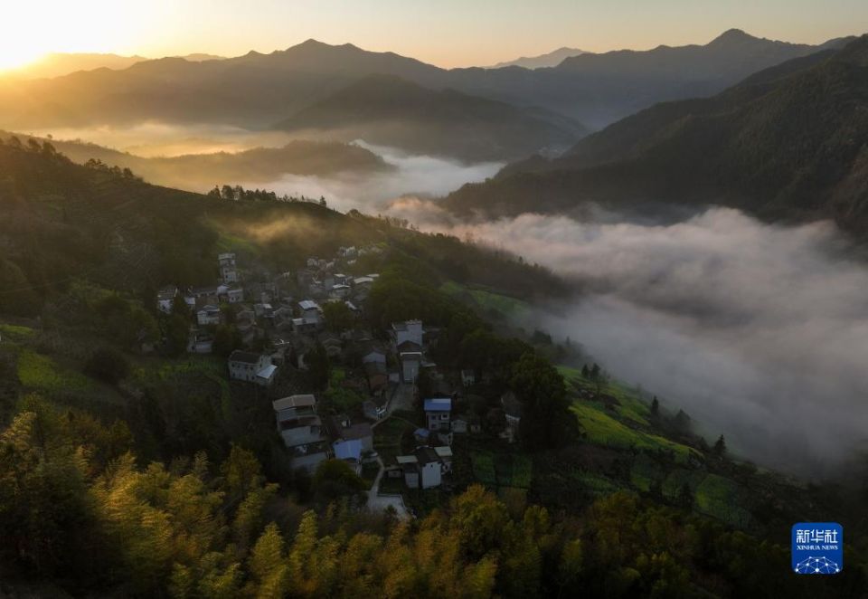 当日,安徽省黄山市歙县霞坑镇石潭村现壮观云海,春景如画。