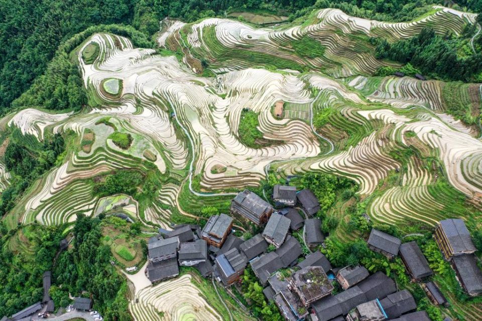 这是广西桂林市龙胜各族自治县龙脊镇大寨村的龙脊梯田的夏日景色。(新华社发)