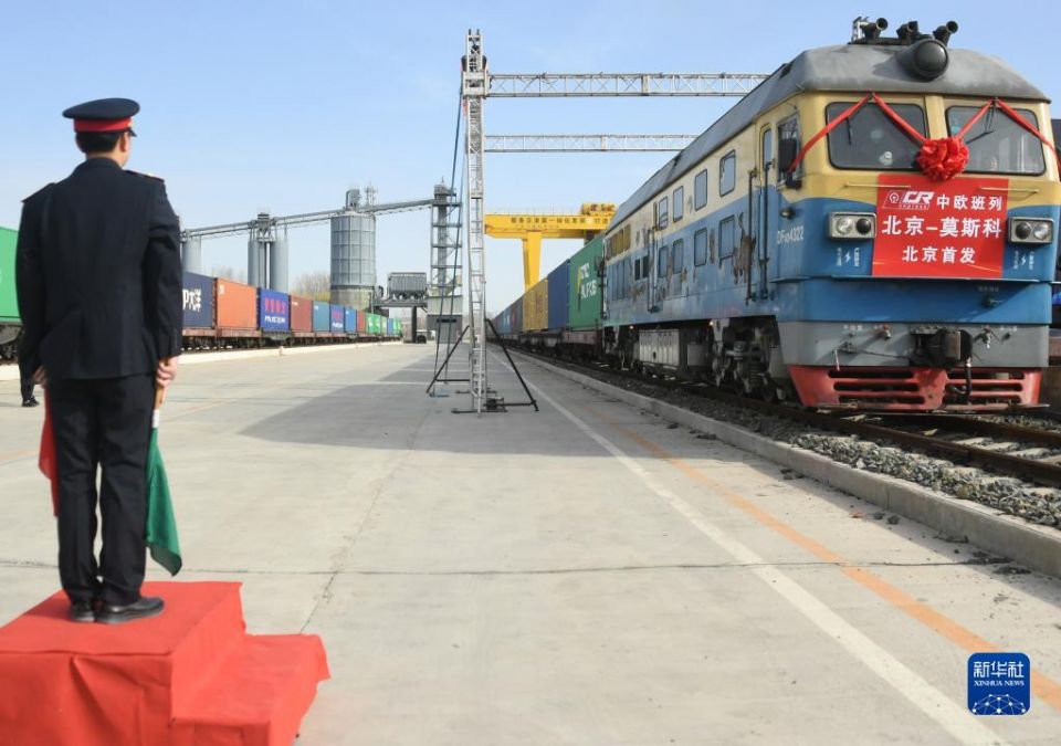 3月16日,在平谷地方铁路马坊站,京平综合物流枢纽中欧班列(北京-莫斯科)发车。新华社记者 任超 摄