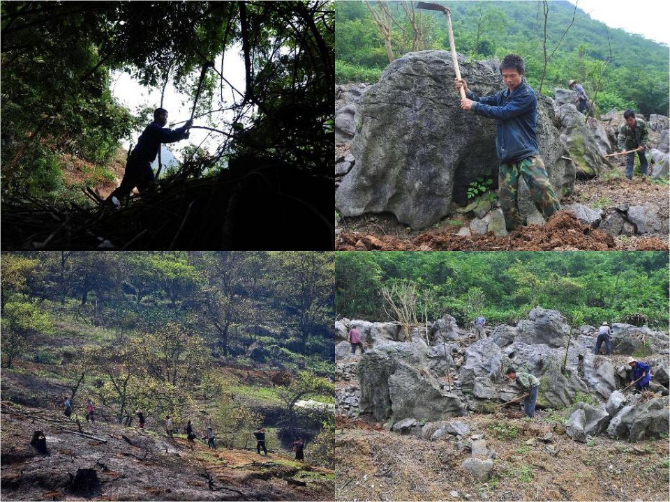 拼版照片:融安县东起乡铜板屯村民改造荒山。上左:铜板屯村民龙飞联在山上砍杂草(2013年7月23日新华社记者黄孝邦摄);上右:铜板屯村民龙革雄 在开垦荒地准备种植李子树苗(2013年5月15日新华社记者黄孝邦摄);下左:铜板屯村民们上山开荒(2013年3月5日新华社记者黄孝邦摄);下右: 铜板屯村民们在种树(2013年5月15日新华社记者张爱林摄)。