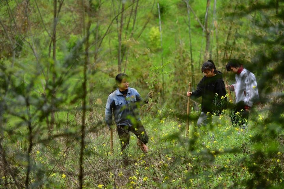 铜板屯村民罗桂枝(左一)带着两个女儿在山上种植李树(2021年3月7日摄)。