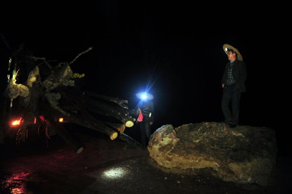 龙革雄在雨夜中准备搬运树苗(2014年2月21日摄)。
