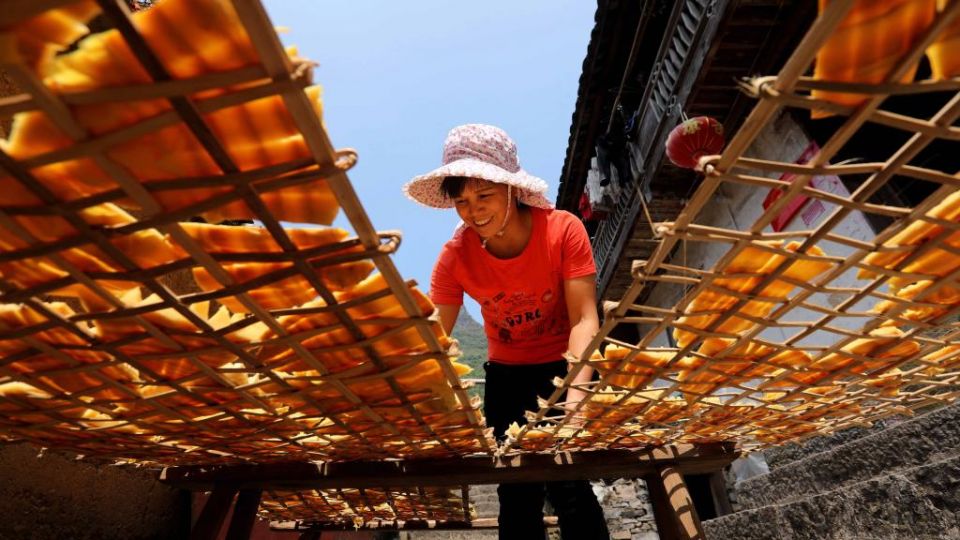 铜板屯村民罗伟枝在晾晒笋干(2018年8月25日摄)。新华社记者 张爱林 摄