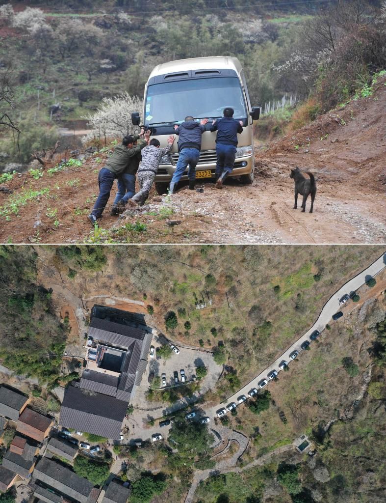 上图:在广西融安县东起乡崖脚村铜板屯,村民将汽车推出泥潭(2014年2月22日摄);下图:汽车停靠在铜板屯的旅游公路上(2021年2月17日摄)。