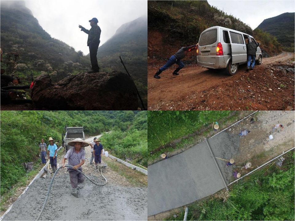 拼版照片:2014年和2015年融安县东起乡铜板屯村民修建进屯道路的场景。上左:一名铜板屯村民在查看地形,准备硬化进屯路(2014年2月18日 新华社记者张爱林摄);上右:铜板屯村民推着车辆经过湿滑路段进入铜板屯(2014年2月18日新华社记者黄孝邦摄);下左:铜板屯村民们在修路 (2015年4月21日新华社记者黄孝邦摄);下右:铜板屯村民们在修路(2015年4月21日新华社记者黄孝邦摄)。