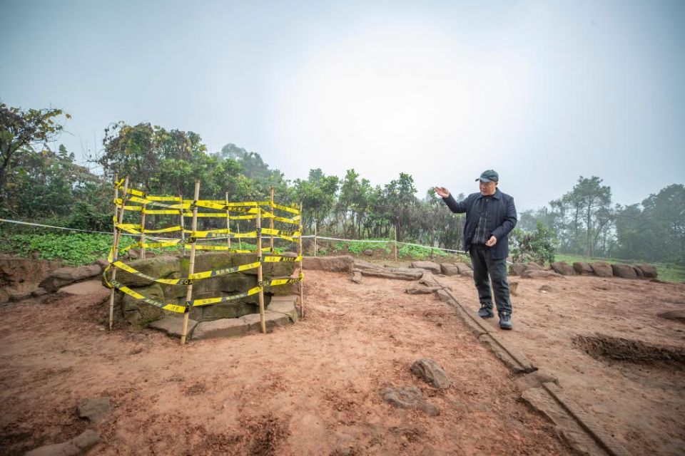 2月9日,在重庆合川钓鱼城遗址,重庆市文物考古研究院副院长袁东山在介绍新发掘出的位于类似阙台建筑基址上的宋井。新华社记者 黄伟 摄