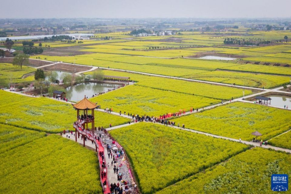 首页 农旅融合 小油菜串起大产业 2023-03-20 08:21:32 分享 3月18日拍摄的油菜花节核心景区(无人机照片)。湖北省沙洋县常年种植油菜面积70余万亩,当地油菜花海深受游客喜爱。2023年3月以来,在沙洋县油菜花节核心景区曾集镇张池村等地,游客成群结队,在金黄色的田野中徜徉,感受美好春光。近年来,沙洋县将油菜产业与文旅产业深度融合,通过赏花经济带动乡村餐饮、民宿等产业发展,助力乡村振兴。新华社记者 伍志尊 摄