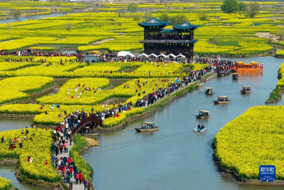 首页 江苏兴化:千垛花海画中游 2023-03-20 08:31:24 分享 3月19日,游客在江苏兴化千垛菜花风景区游览(无人机照片)。近日,江苏兴化千垛菜花风景区沟河交错围成的垛田上,油菜花次第开放,吸引人们前来踏青赏花。新华社发(汤德宏摄)