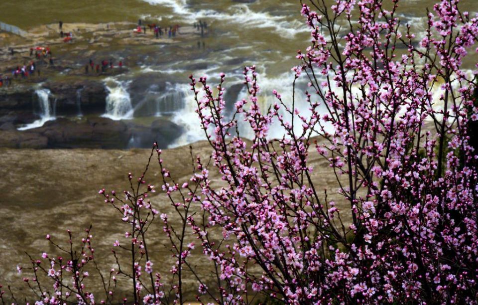 黄河岸边山花开放,和远处的壶口瀑布交相辉映。新华社记者王飞航 摄