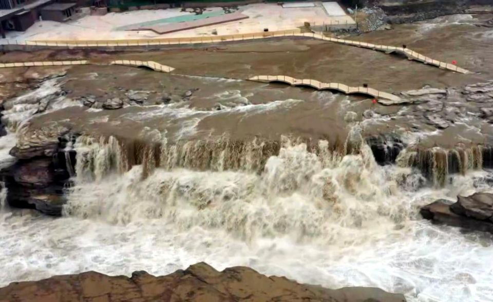 站在壶口瀑布岸边,只见宽阔的河道激流奔涌,瀑面明显抬高,瀑布绵延数百米,形成瀑布群。使用无人机从高空俯瞰,黄河水如千军布阵、万马奔腾,气势如虹,景色壮观。