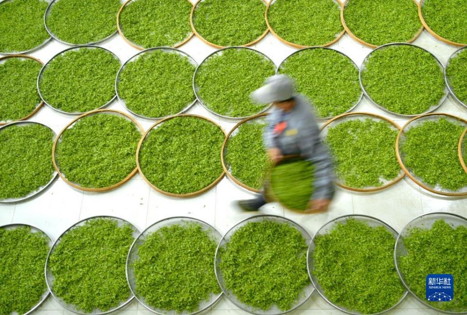 首页 春到茶山采茶制茶忙 2023-03-23 08:46:29 分享 3月22日,湖北省宣恩县椒园镇一茶厂的工人在摊晾茶叶鲜叶。随着气温回暖,多地茶区进入春茶采摘加工期,茶农抢抓农时采摘春茶,供应市场,茶园一片忙碌景象。新华社发(宋文 摄)