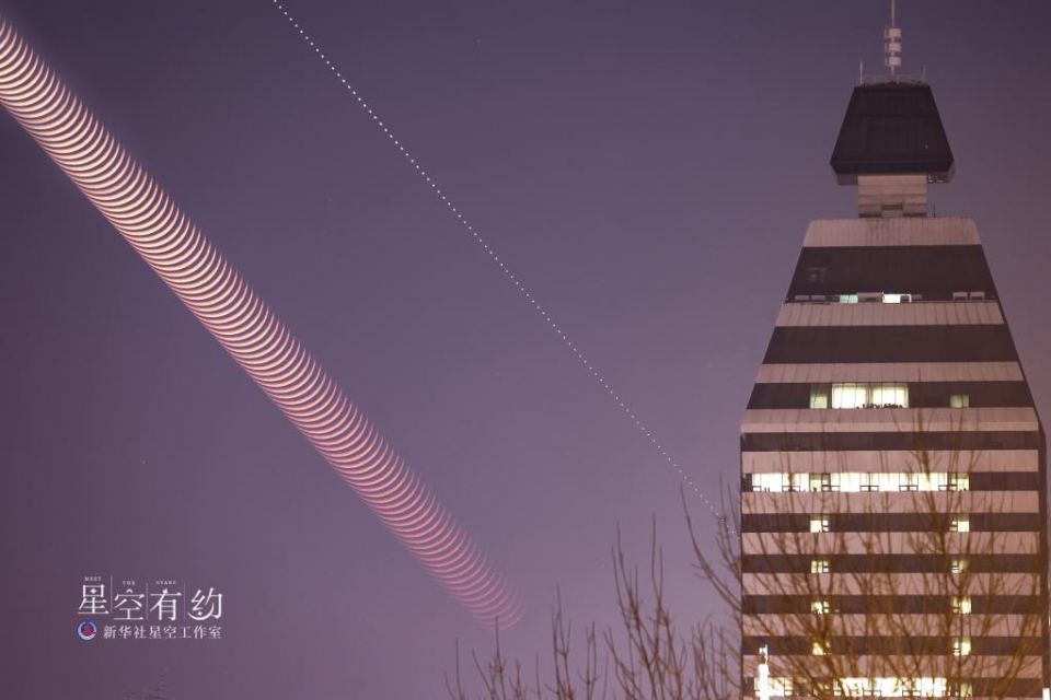 这是北京市天文摄影爱好者王俊峰2023年2月22日在北京市西城区拍摄的金星伴月牙(多张轨迹叠加)。(本人供图)